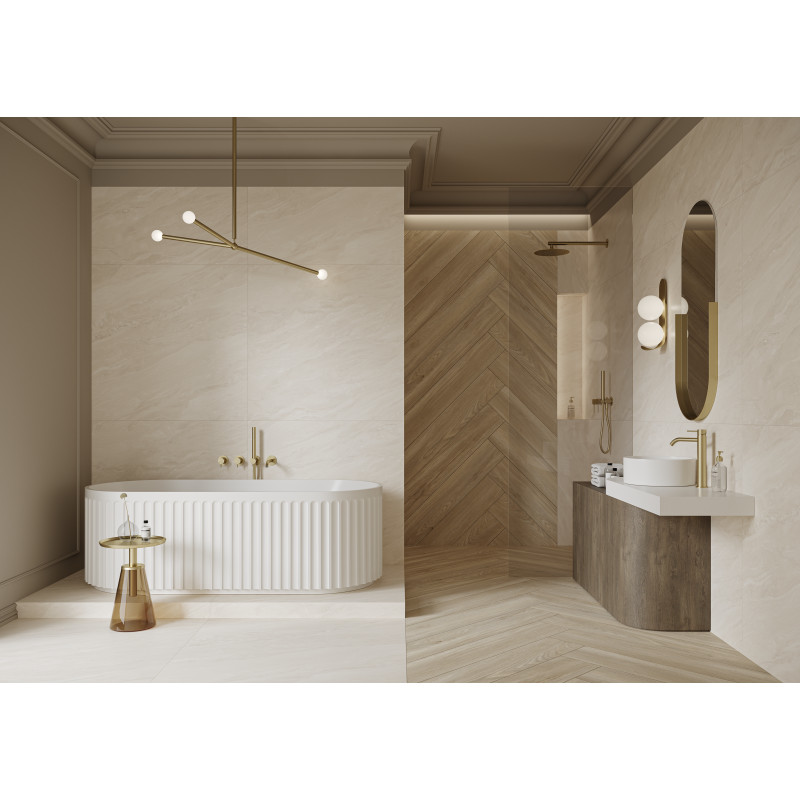 Gres Ladispoli w odcieniu taupe to mistrzowska interpretacja klasycznego kamienia, jakim jest trawertyn. Wyjątkowość tej kolekcji drzemie w wykończeniu matt carving – innowacyjnej technologii, która sprawia, że delikatne żyłkowania są wyczuwalne pod palcami i subtelnie lśnią pod wpływem światła, podczas gdy reszta płytki pozostaje matowa. Ten gres wielkoformatowy o wymiarach 100x100 cm pozwala na realizację modnego trendu tile drenching, polegającego na spójnym pokryciu podłóg i ścian tym samym materiałem, co tworzy harmonijną, otulającą przestrzeń.